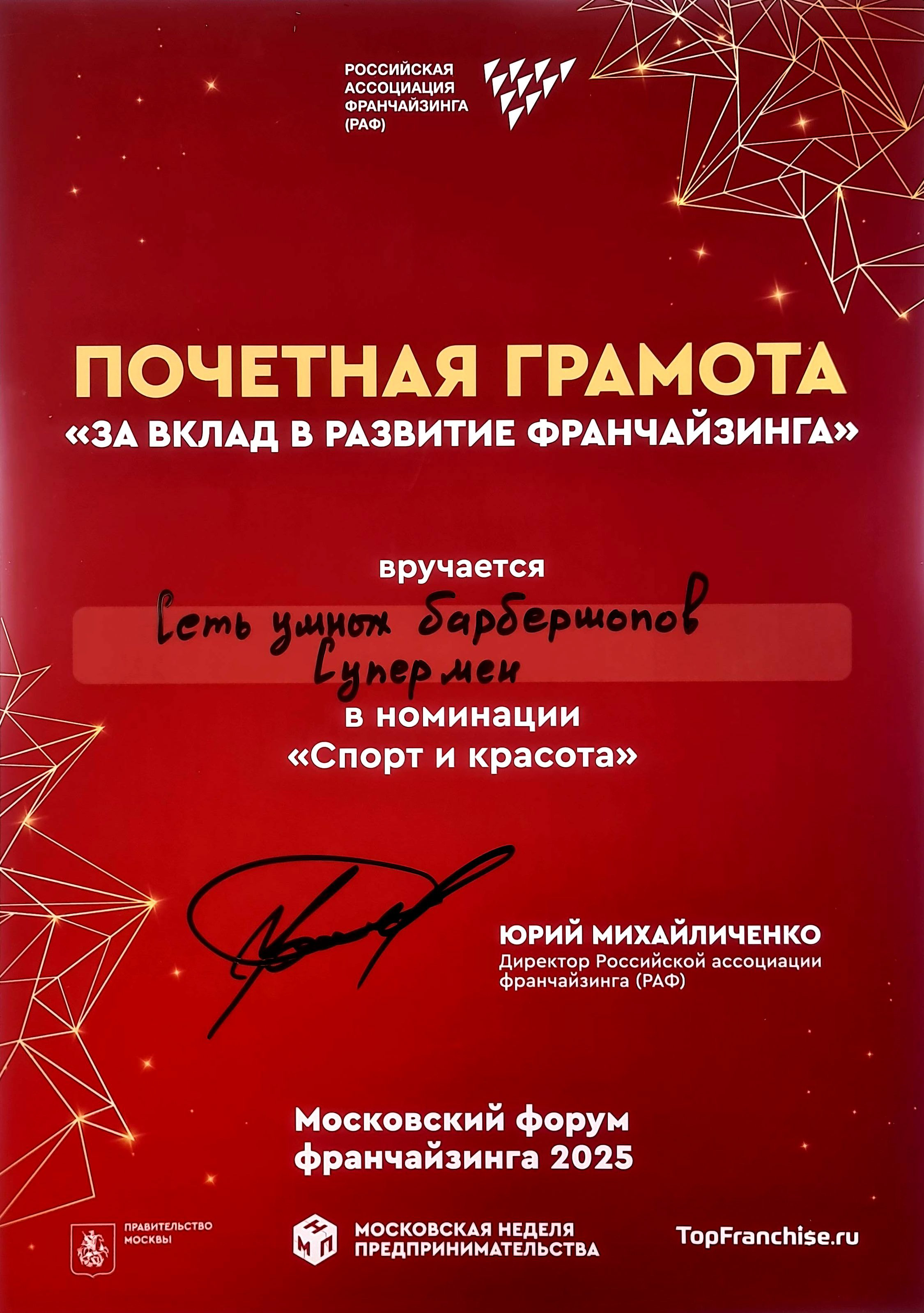 Очень много раз отвечал на многочисленные, интересующие всех вопросы , участвовал в различного рода мероприятиях, связанных с сетью Супермен, встречался и консультировал ПОТЕНЦИАЛЬНЫХ партнеров, многие из которых теперь уже являются ДЕЙСТВУЮЩИМИ партнерами.....а вот отзыв о самом Супермене решил написать впервые. Наверное не стоит писать, что заниматься данным бизнесом, это очень круто, что за относительно небольшие вложения, человек получает готовую рабочую бизнес модель, что Управляющая компания и вся наша СуперКоманда, пожалуй самая дружная на планете....можно просто указать на тот факт, что меньше чем за год, я открыл 3 своих салона Супермен. Изначально данный бизнес планировался как дополнительный, паралельно с другим бизнесом в сфере розничной торговли, но вовлеченность во все процессы и те вызовы, которые Супермен бросал мне на стадии открытия и раскрутки салонов, полностью поглотили меня. Я просто полюбил его. И сейчас, в минуты глубоких размышлений, вглядываясь в завтрашний день, я вижу светлый путь, который Супермену еще предстоит пройти, завоевывая все новые и новые территории, и сердца тех людей, которые ценят свое время! И считают стрижку не предметом роскоши, а жизненную необходимость. Поэтому ДА! Я готов продолжать начатый путь и расширяться, это лишь вопрос времени.. хотя, зачастую вопросы расширения приходят настолько спонтанно, что как любят говорить у нас в Управляющей компании: "вектор развития" должен быть выше "вектора страха" - это единственное, о чем ты успеваешь задуматься.